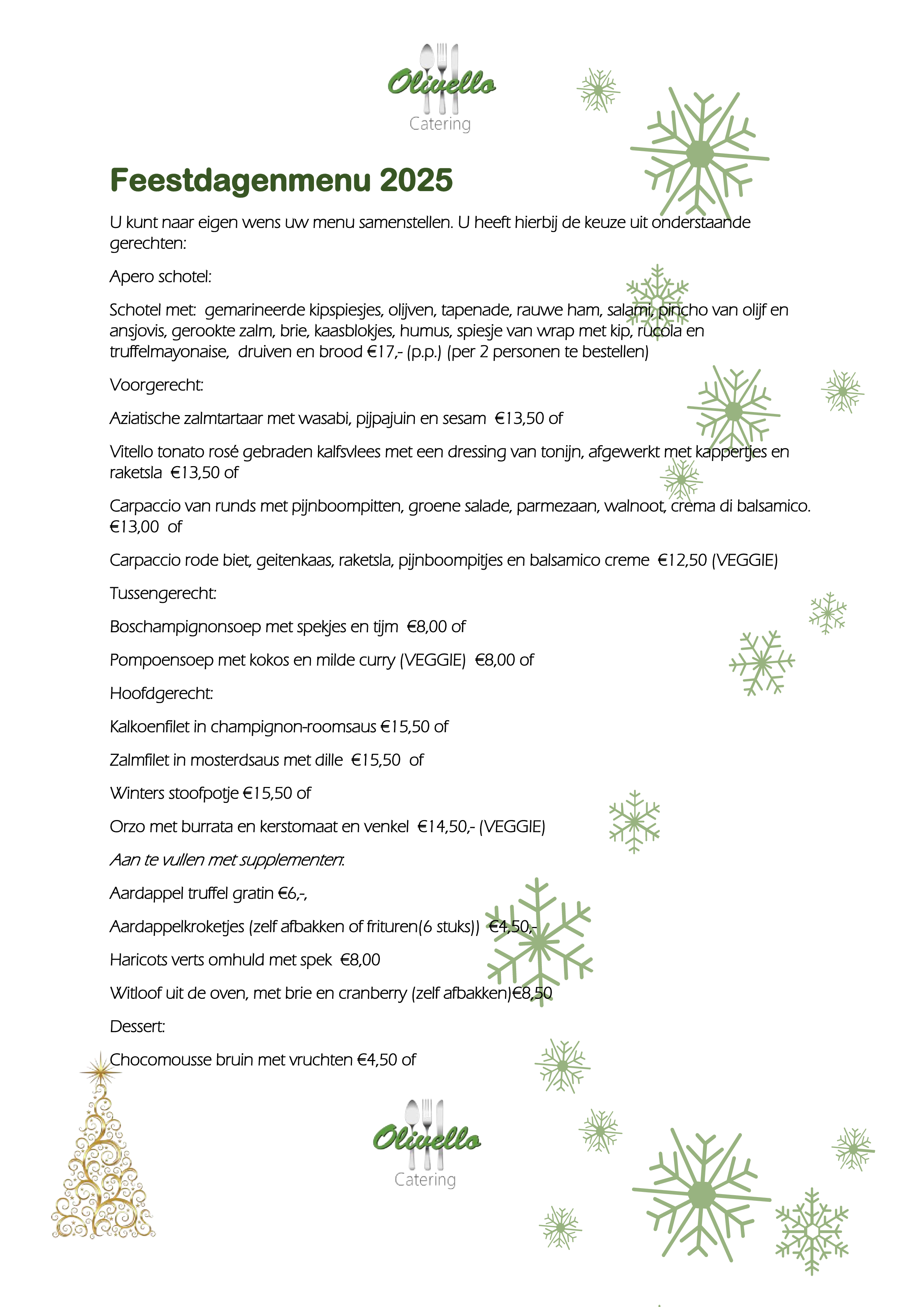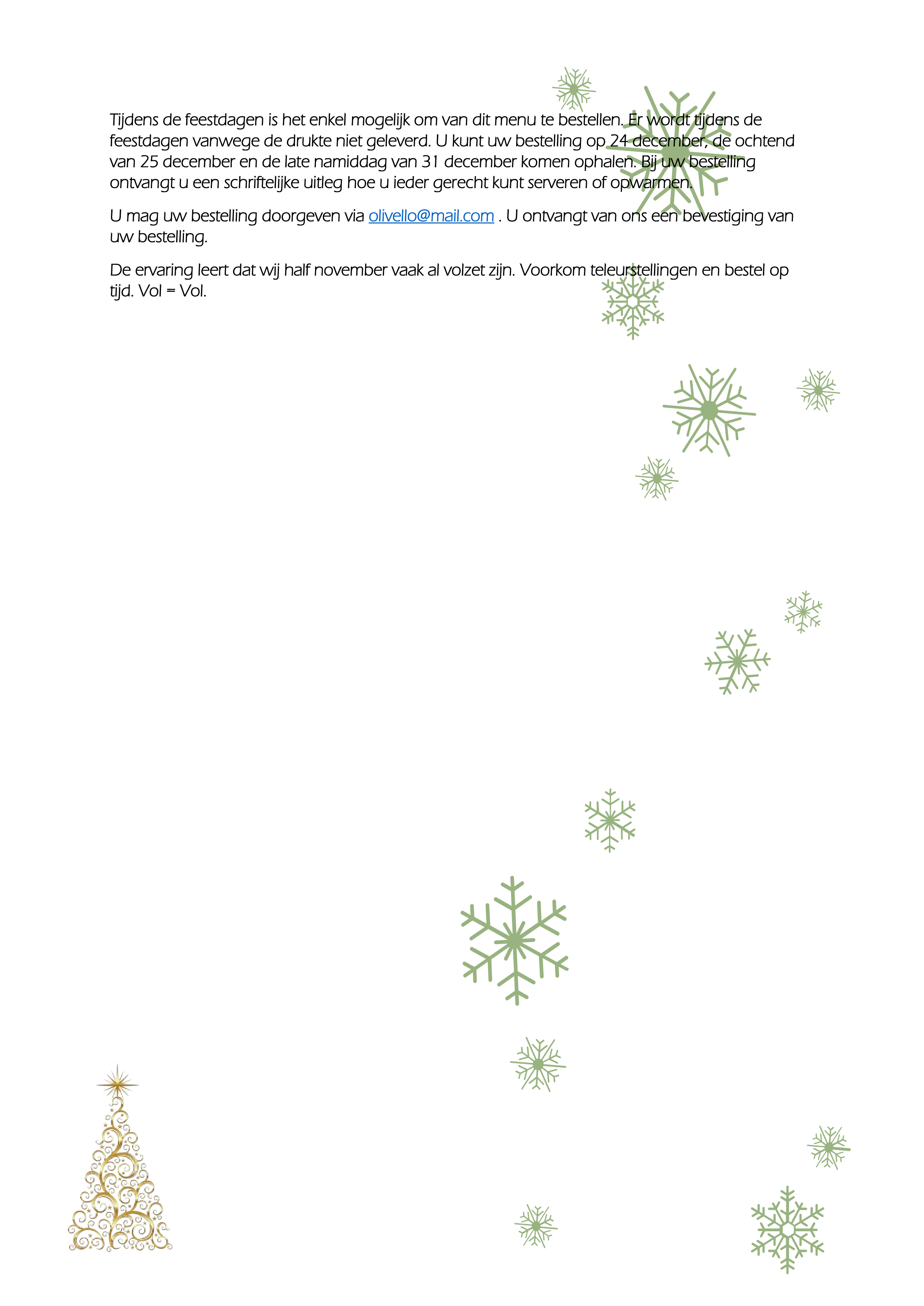 Tijdens de feestdagen is het enkel mogelijk om van dit menu te bestellen. Er wordt tijdens de feestdagen vanwege de drukte niet geleverd. U kunt uw bestelling op 24 december, de ochtend van 25 december en de late namiddag van 31 december komen ophalen. Bij uw bestelling ontvangt u een schriftelijke uitleg hoe u ieder gerecht kunt serveren of opwarmen.