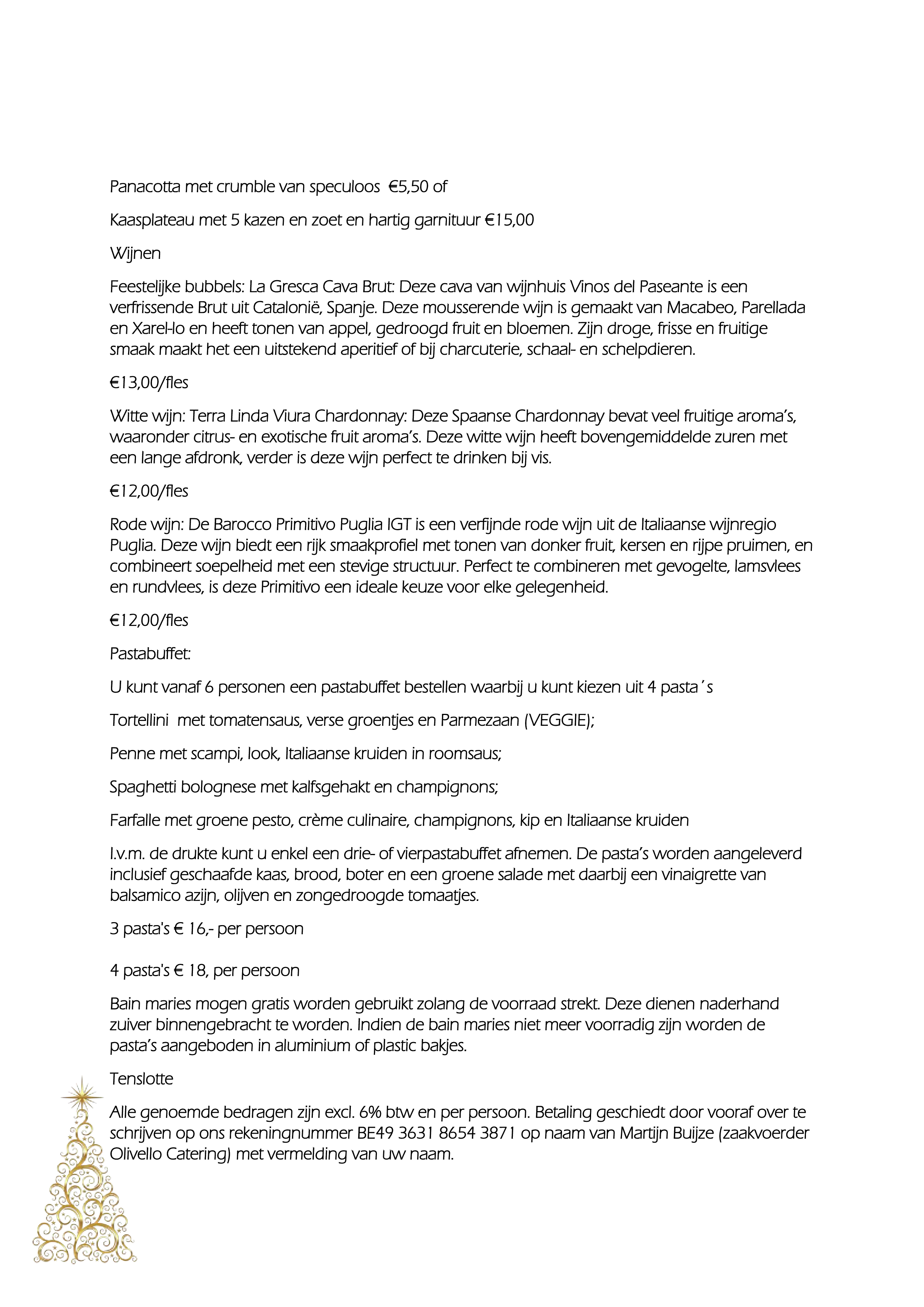 Alle genoemde bedragen zijn excl. 6% btw en per persoon. Betaling geschiedt door vooraf over te schrijven op ons rekeningnummer BE49 3631 8654 3871 op naam van Martijn Buijze (zaakvoerder Olivello Catering) met vermelding van uw naam.